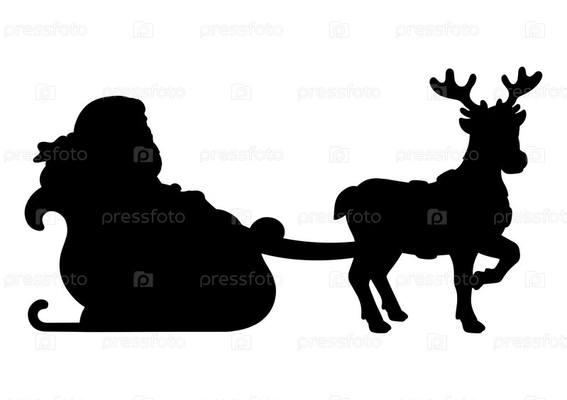 Санта-Клаус везет рождественские подарки на оленьих санях. Черный силуэт. Элемент дизайна. Векторная иллюстрация на белом фоне. Шаблон для книг, наклеек, плакатов, открыток, одежды