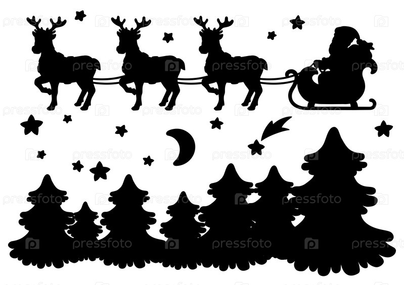 Санта-Клаус везет рождественские подарки на оленьих санях. Ночной лес. Черный силуэт. Элемент дизайна. Шаблон для книг, наклеек, плакатов, открыток, одежды