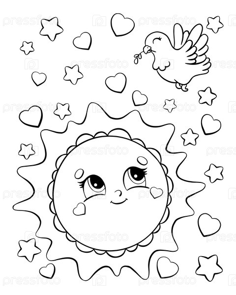 Раскраска для детей. Солнце и голубь. Персонаж в мультяшном стиле. Векторная иллюстрация на белом фоне
