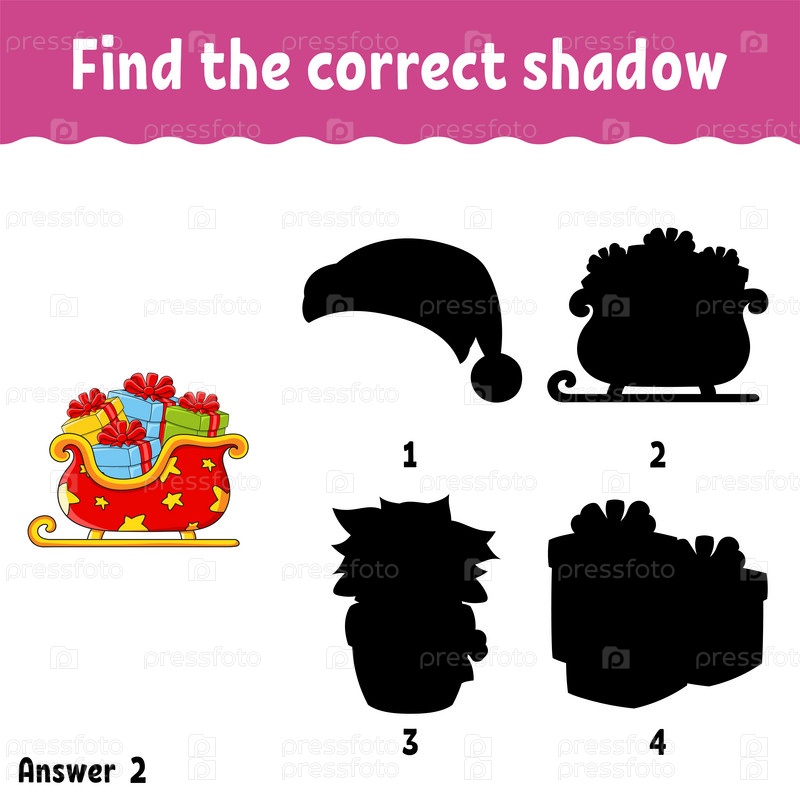 Найдите правильную тень. Рабочий лист по развитию образования. Рождественская тема. Игра на соответствие для детей. Страница с заданиями. Головоломка для детей. Персонаж мультфильма. Изолированная векторная иллюстрация
