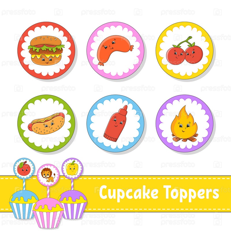 Украшение для кексов. Набор из шести круглых картинок. Тематика барбекю. Персонажи мультфильмов. Милое изображение. На день рождения, празднование рождения ребенка