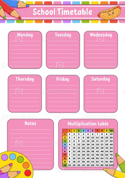Расписание школы с таблицей умножения. Для обучения детей. Изолировано на белом фоне. С милым персонажем мультфильма