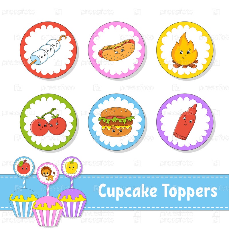 Украшение для кексов. Набор из шести круглых картинок. Тематика барбекю. Персонажи мультфильмов. Милое изображение. На день рождения, празднование рождения ребенка