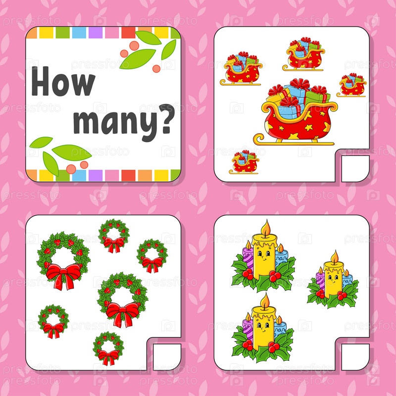 Игра-подсчет для детей. Счастливые персонажи. Изучение математики. Сколько объектов на картинке. Рабочий лист по образованию. Рождественская тема. Изолированная векторная иллюстрация в милом мультяшном стиле