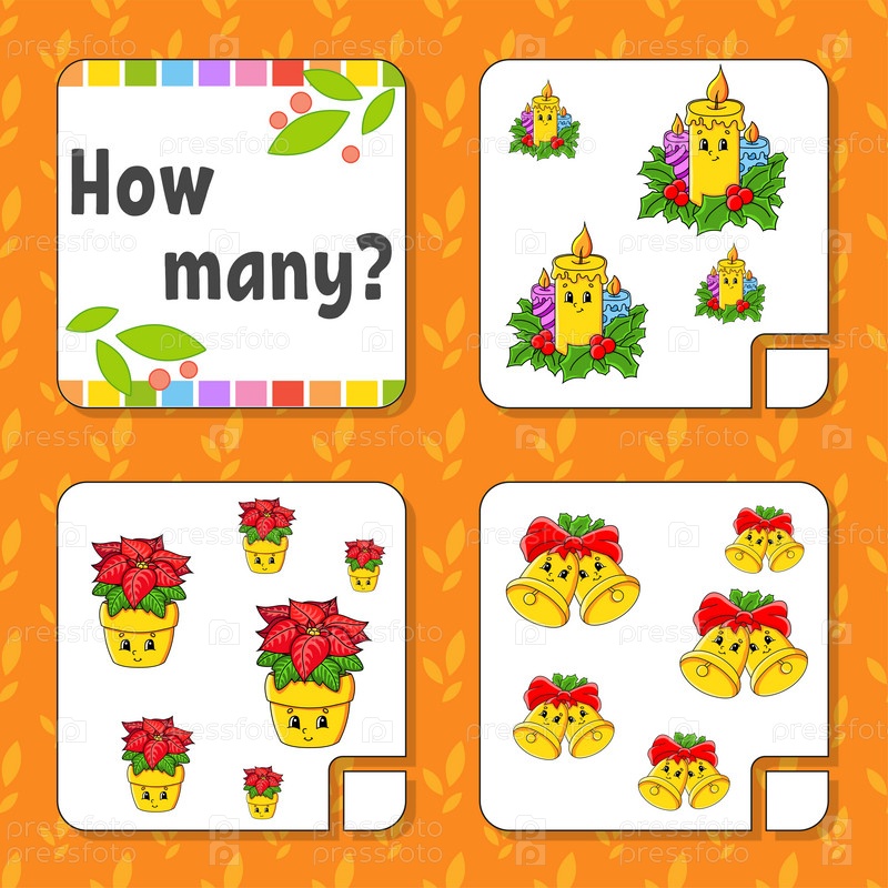 Игра-подсчет для детей. Счастливые персонажи. Изучение математики. Сколько объектов на картинке. Рабочий лист по образованию. Рождественская тема. Изолированная векторная иллюстрация в милом мультяшном стиле