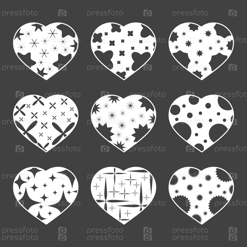 Набор изолированных сердец с белым контуром на черном фоне. С абстрактным узором. Простая плоская векторная иллюстрация. Подходит для поздравительных открыток, свадеб, праздников, сайтов