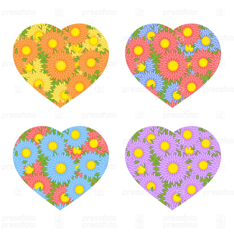 Набор цветных изолированных сердец на белом фоне. С романтическим цветочным узором. Простая плоская векторная иллюстрация. Подходит для оформления открыток, свадеб, праздников, сайтов
