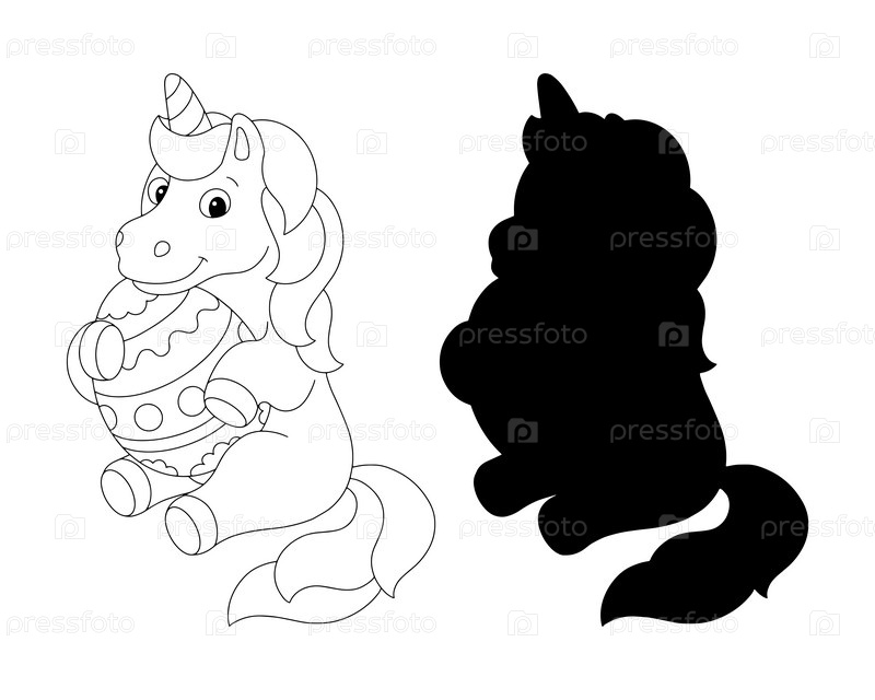 Забавный единорог держит большое пасхальное яйцо. Черный силуэт. Элемент дизайна. Векторная иллюстрация на белом фоне. Шаблон для книг, наклеек, плакатов, открыток, одежды