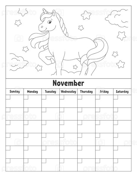 Пустой шаблон календаря на один месяц без дат. Красочный дизайн с милым персонажем. Векторная иллюстрация