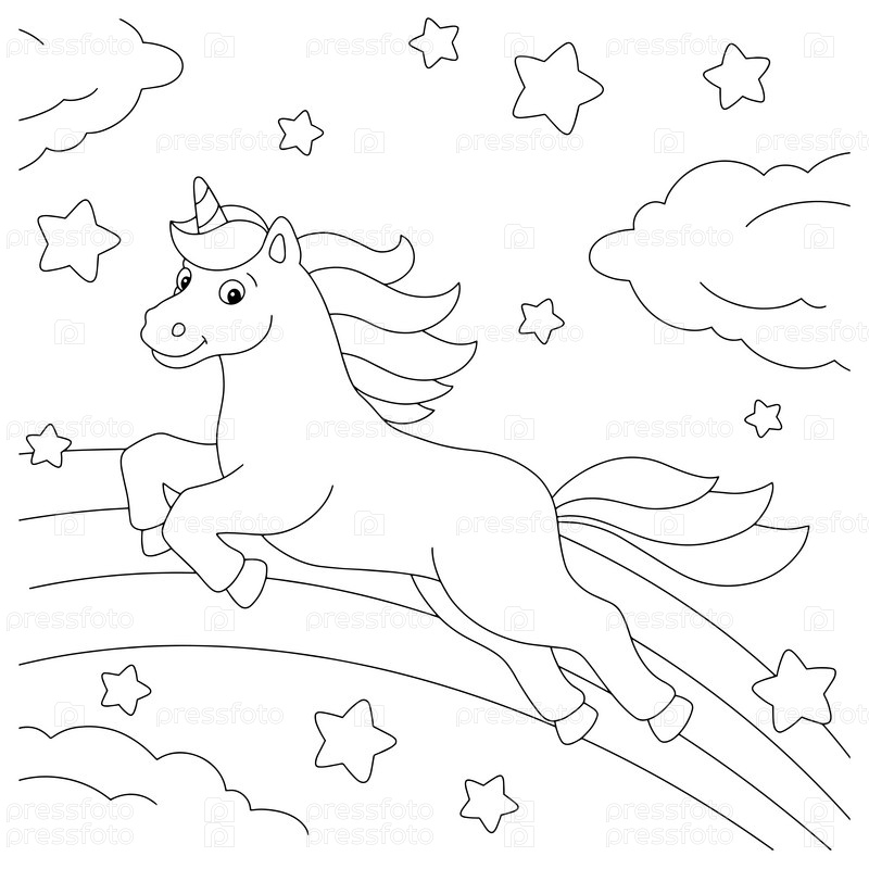 Единорог летит по небу. Страница раскраски для детей. Персонаж в мультяшном стиле. Векторная иллюстрация на белом фоне