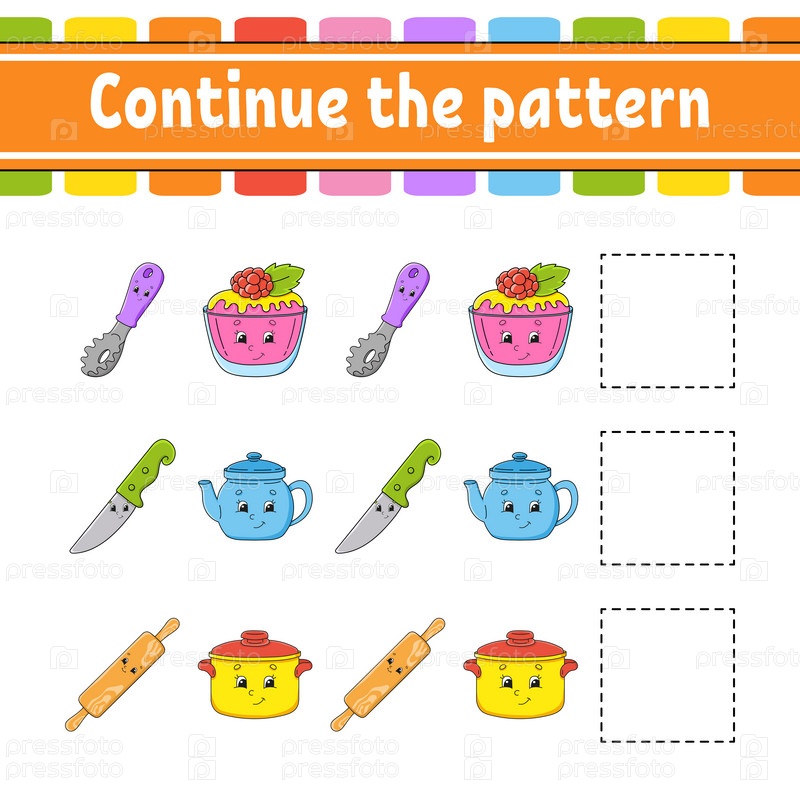 Продолжите узор. Развивающий рабочий лист для обучения. Игра для детей. Страница с заданиями. Головоломка для детей. Загадка для дошкольников. Милый мультяшный стиль. Векторная иллюстрация