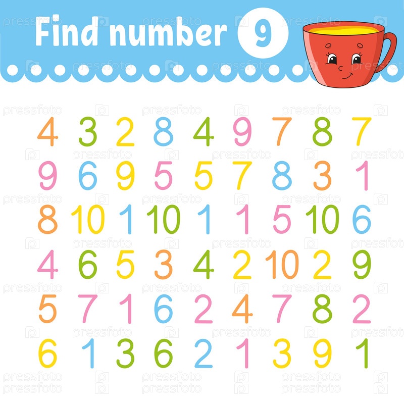 Найдите число. Образовательный развивающий рабочий лист. Страница с заданиями с картинками. Игра для детей. Забавный персонаж. Мультяшный стиль. Векторная иллюстрация