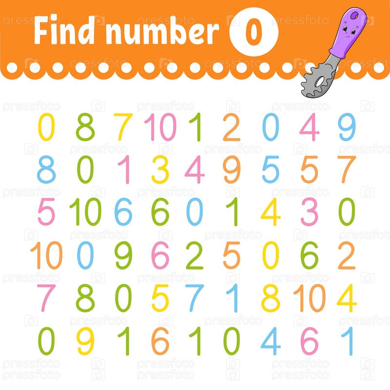 Найдите число. Образовательный развивающий рабочий лист. Страница с заданиями с картинками. Игра для детей. Забавный персонаж. Мультяшный стиль. Векторная иллюстрация