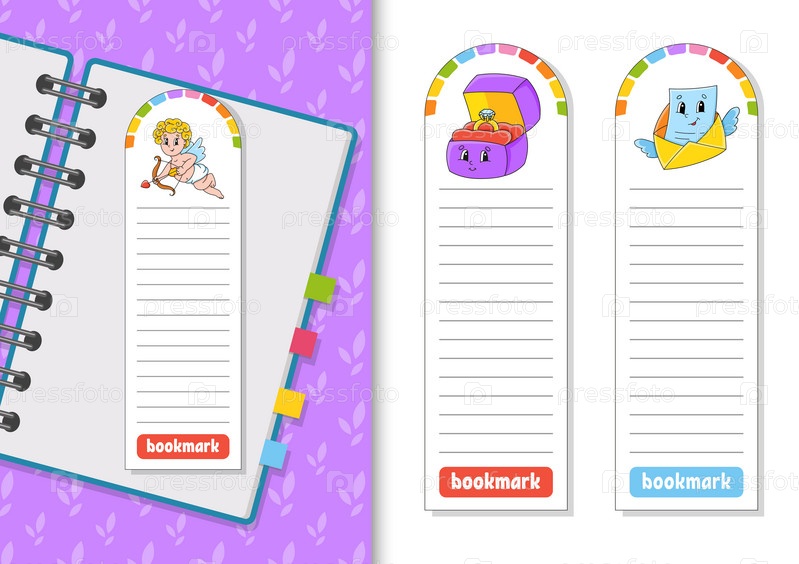Набор бумажных закладок для книг с милыми мультяшными персонажами. Для детей. Изолированные на белом фоне. Векторная иллюстрация