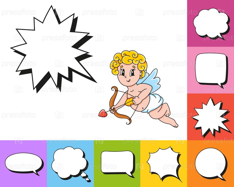 Речевой пузырь разной формы. С милым мультяшным персонажем. Нарисованный от руки. Мыслящие шары. Изолированные на белом фоне. Векторная иллюстрация