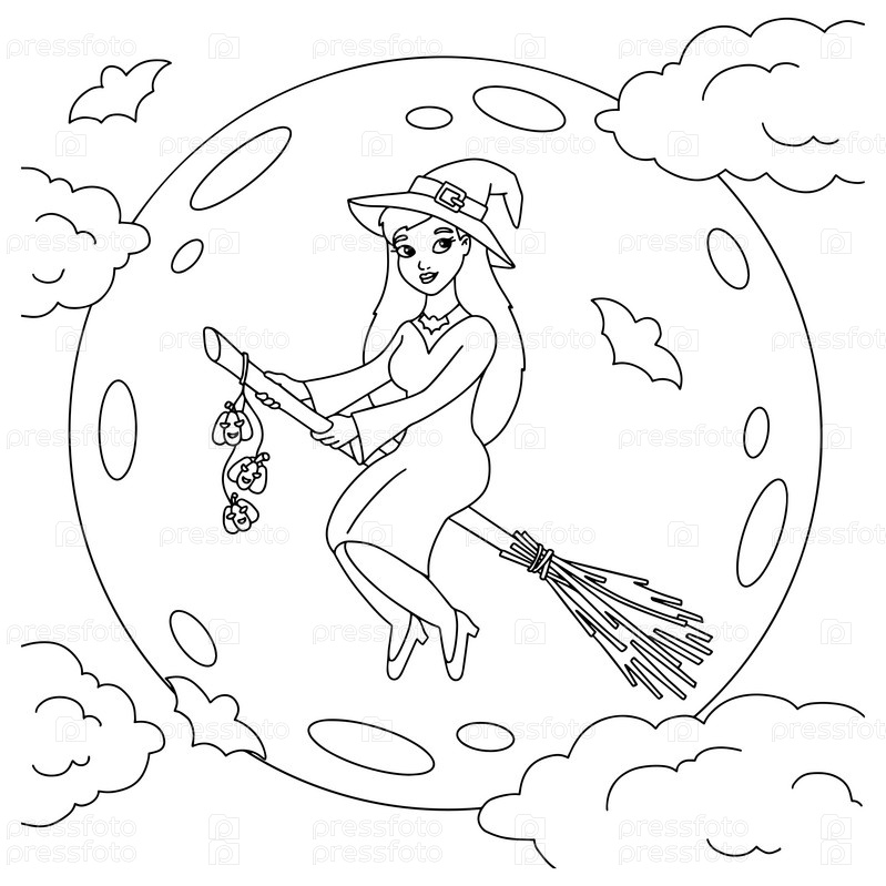 Молодая ведьма летает на метле ночью. Страница раскраски для детей. Персонаж в мультяшном стиле. Векторная иллюстрация на белом фоне. Тема Хэллоуина