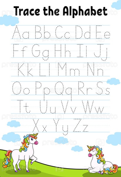 Написание букв. Страница с прописями единорога. Практический лист. Рабочий лист для детей. Учим алфавит. Милый персонаж. Цветная векторная иллюстрация. Мультяшный стиль