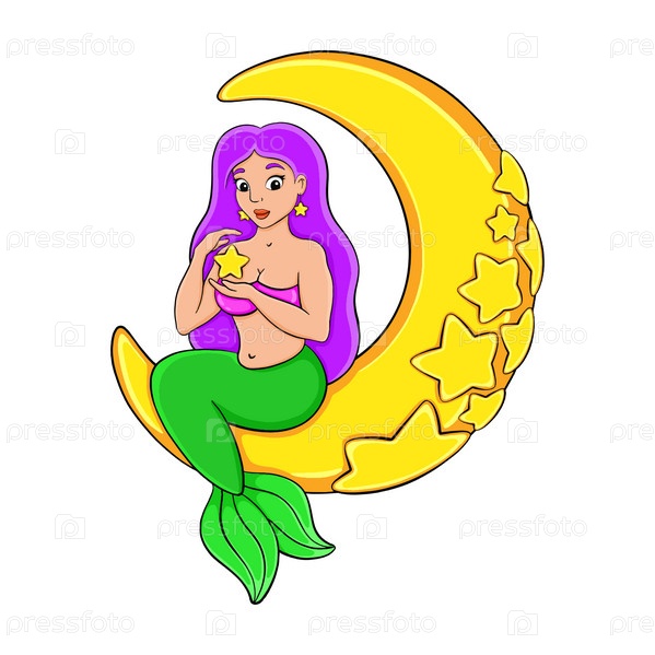 Красивая русалка сидит на луне. Персонаж мультфильма. Красочная векторная иллюстрация. Изолирована на белом фоне. Элемент дизайна. Шаблон для вашего дизайна, книги, наклейки, открытки