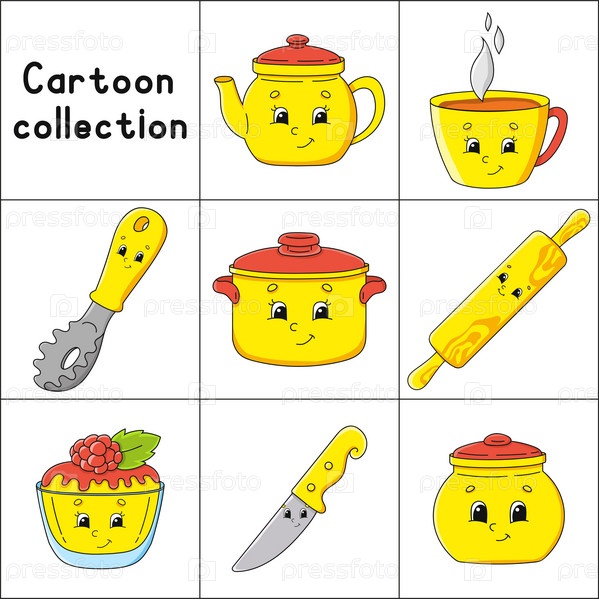 Тема посуды. Персонаж мультфильма. Красочные векторные иллюстрации. Изолированные на белом фоне. Элемент дизайна. Шаблон для вашего дизайна, книги, наклейки, открытки