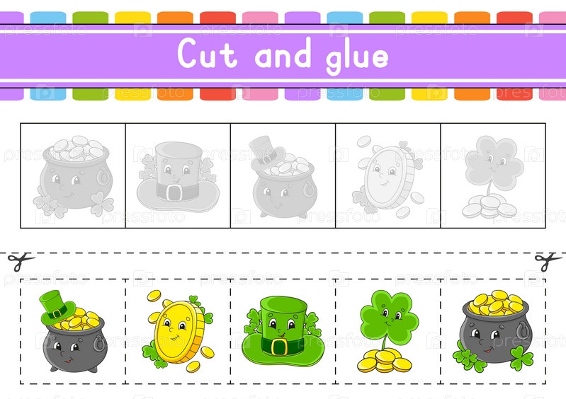 Разрезай и играй. Бумажная игра с клеем. Флэш-карточки. Рабочий лист для обучения. Страница с заданиями. Практика работы с ножницами. Изолированная векторная иллюстрация. Мультяшный стиль. День Святого Патрика