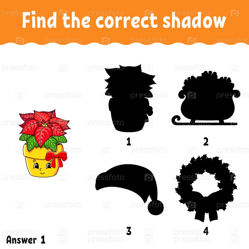 Найдите правильную тень. Рабочий лист по развитию образования. Рождественская тема. Игра на соответствие для детей. Страница с заданиями. Головоломка для детей. Персонаж мультфильма. Изолированная векторная иллюстрация