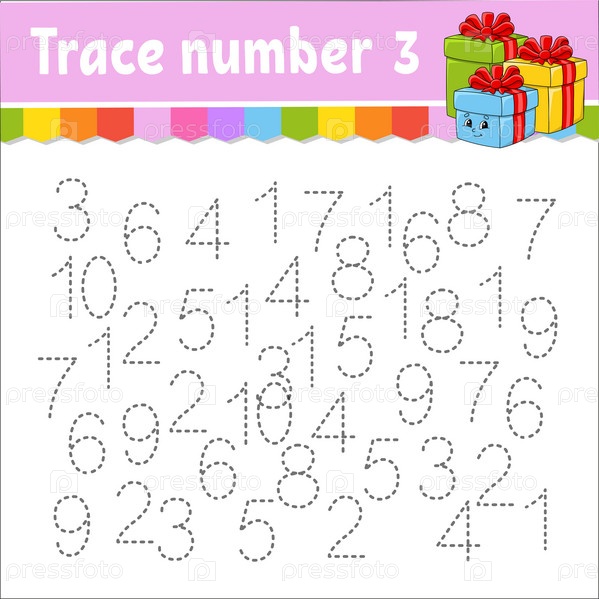 Номер трассировки. Практика письма. Изучение цифр для детей. Рабочий лист по развитию образования. Страница с заданиями. Рождественская тема. Изолированная векторная иллюстрация в милом мультяшном стиле