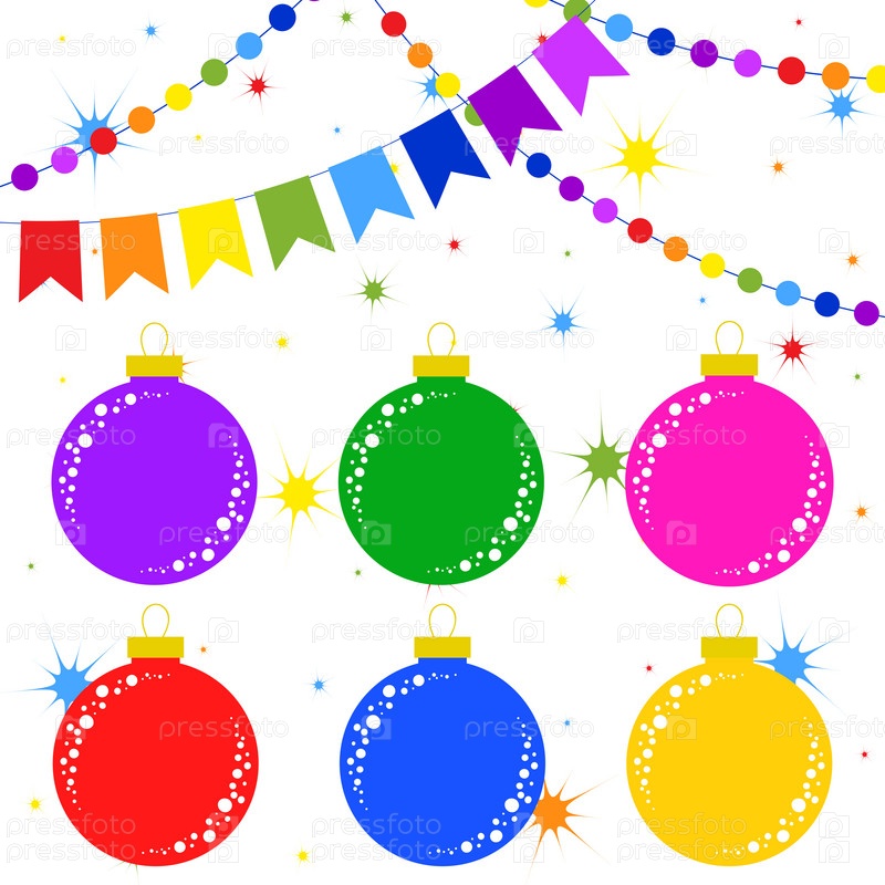 Плоский цветной набор изолированных елочных игрушек в виде шаров и гирлянд. Простой дизайн для обработки