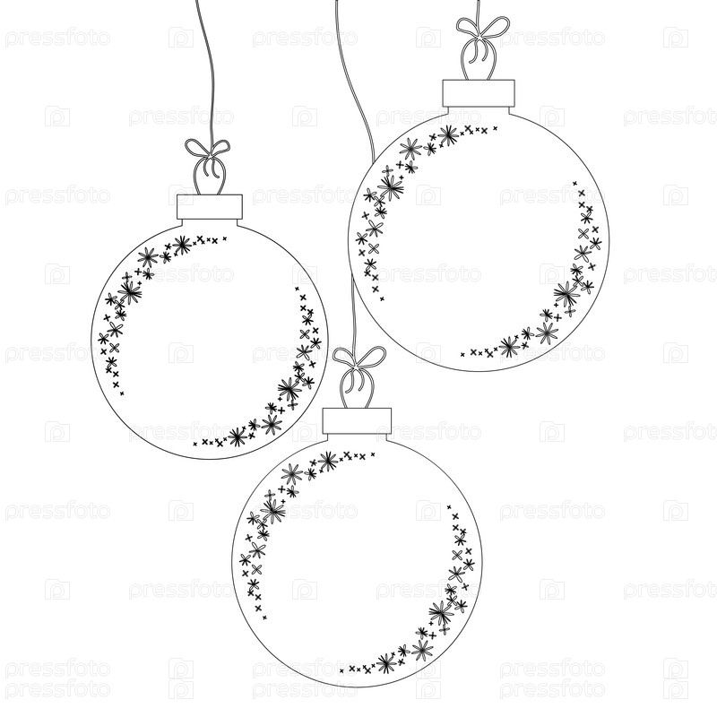 Набор плоских изолированных силуэтов елочных игрушек шаров. Белый объект с черным контуром