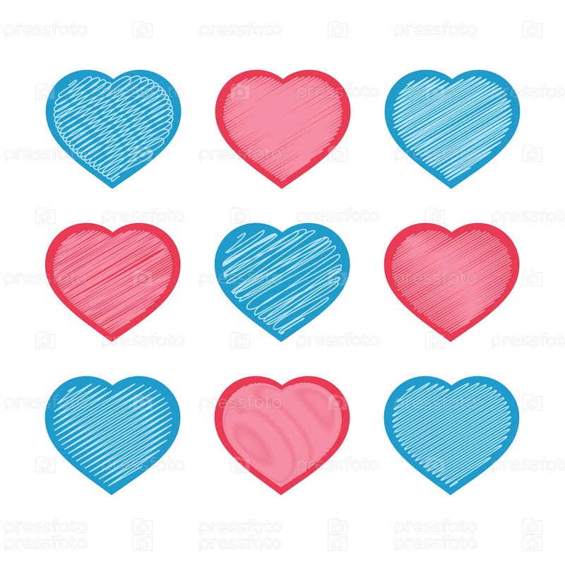 Набор красных и синих сердец, изолированных на белом фоне. С абстрактным рисунком линий. Простая плоская векторная иллюстрация. Подходит для поздравительных открыток, свадеб, праздников, сайтов