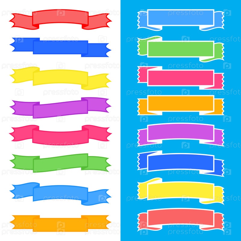 Набор цветных изолированных лент-баннеров с штрихами на белом и синем фоне. Простая плоская векторная иллюстрация. С местом для текста. Подходит для инфографики, дизайна, рекламы, праздников, этикеток