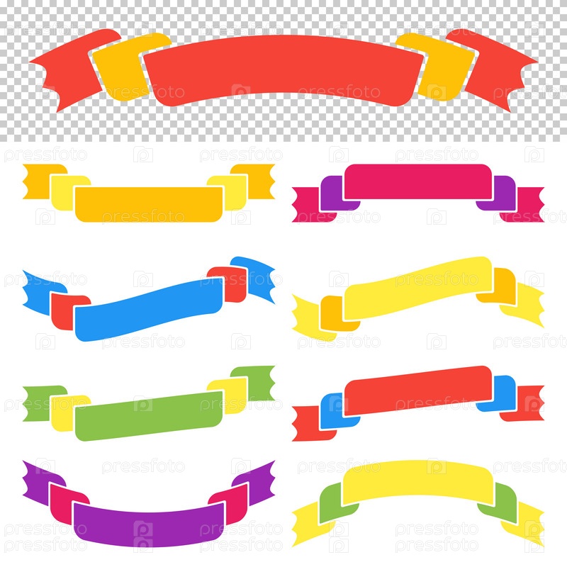 Набор цветных изолированных баннерных лент на прозрачном и белом фоне. Простая плоская векторная иллюстрация. С местом для текста. Подходит для инфографики, дизайна, рекламы, праздников, этикеток
