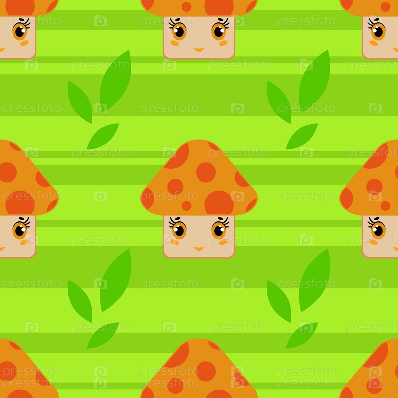 Цветной бесшовный узор из милых улыбающихся грибов на зеленом полосатом фоне. Простая плоская векторная иллюстрация. Подходит для обоев, ткани, оберточной бумаги, обложек
