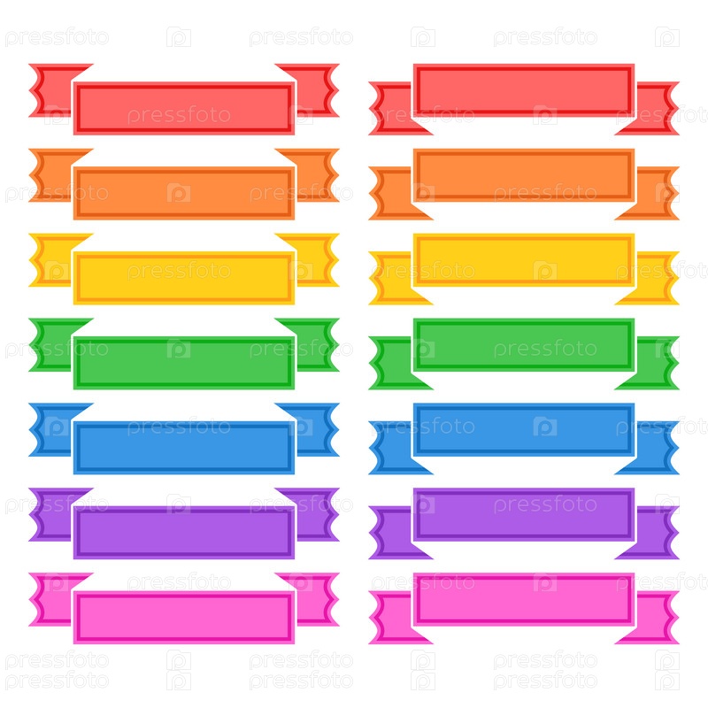 Набор плоских изолированных цветных лент и баннеров на белом фоне. Простая плоская векторная иллюстрация. С местом для текста. Подходит для инфографики, дизайна, рекламы, фестивалей, этикеток