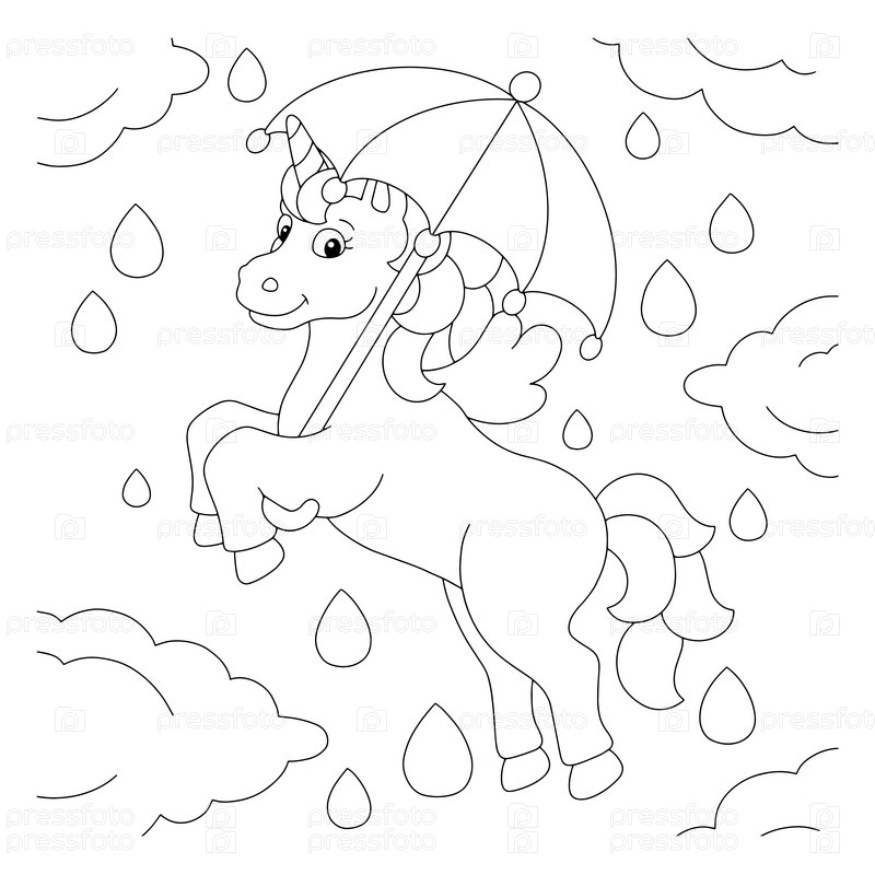 Единорог гуляет по небу под дождем с зонтиком. Страница раскраски для детей. Персонаж в мультяшном стиле. Векторная иллюстрация на белом фоне