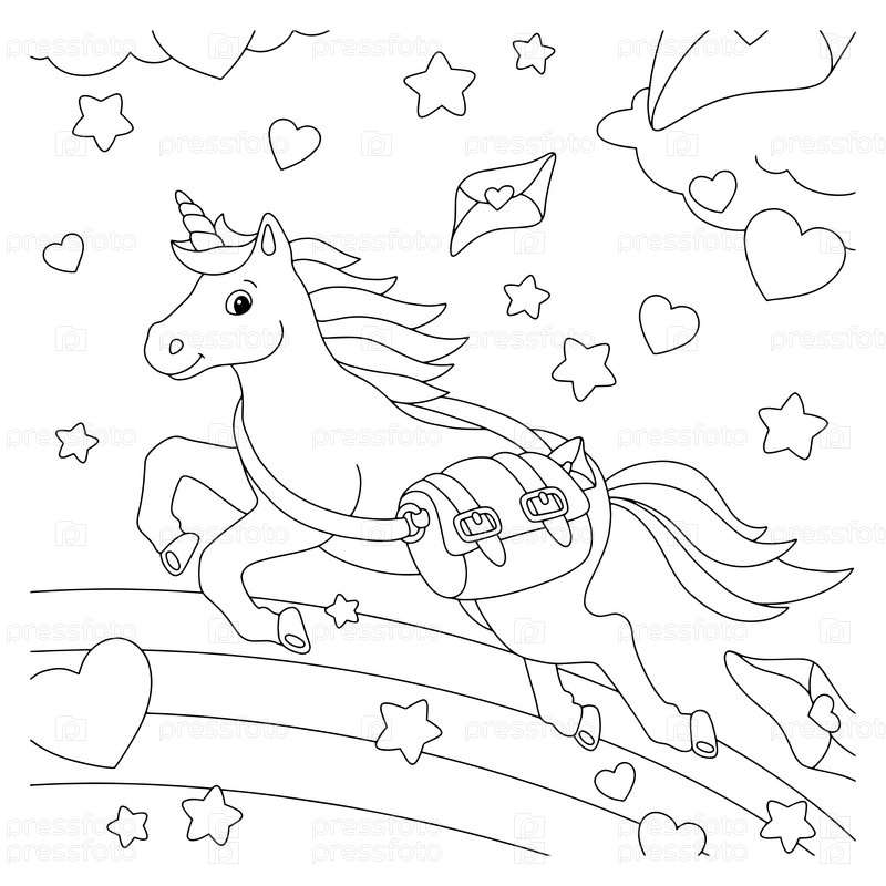 Почтальон-единорог с сумкой любовных писем. Раскраска для детей. День святого Валентина. Персонаж в мультяшном стиле. Векторная иллюстрация на белом фоне