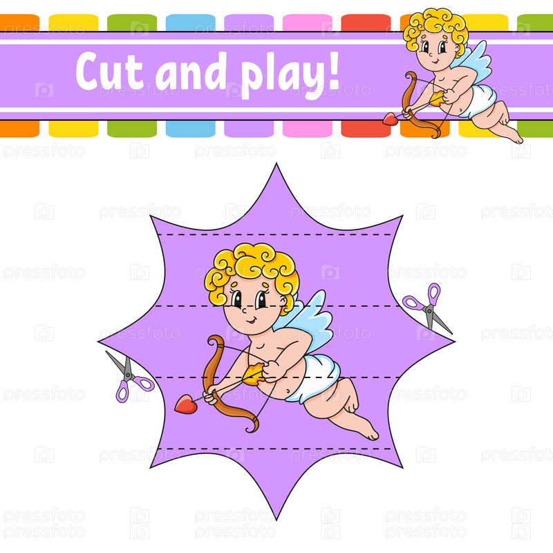 Разрезай и играй. Логическая головоломка для детей. Образовательный развивающий рабочий лист. Обучающая игра. Страница с заданиями. Практика вырезания для дошкольников. Векторная иллюстрация