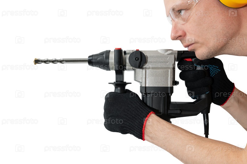 Профессиональный рабочий с ударной дрелью в руках на изолированном белом фоне. Инструмент для сверления бетона и кирпича. Строительные работы