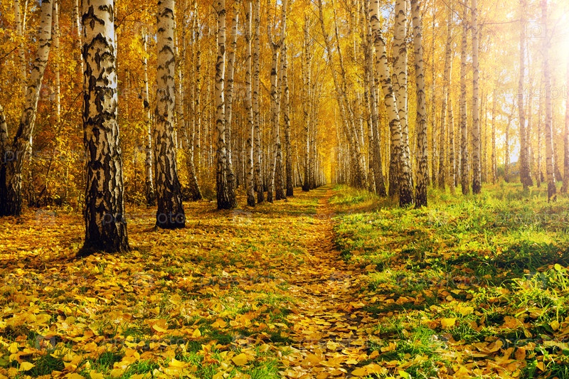 Осенний пейзаж в березовой роще, освещенной солнцем. Сезонная солнечная погода. Яркая оранжево-желтая листва