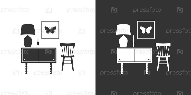 Интерьерная мебельная иконка с тумбочкой и стулом. Черная и белая