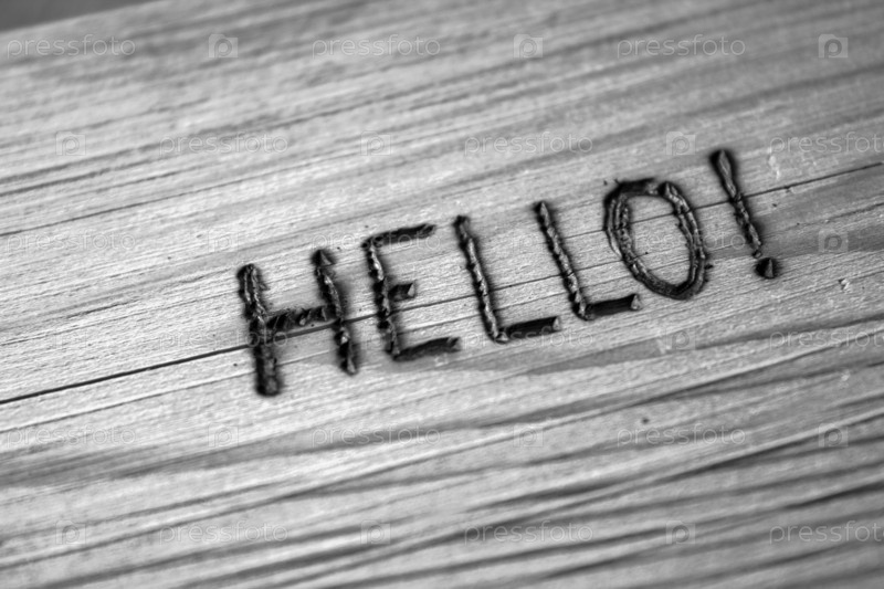 Слово выжжено вручную на плоской деревянной доске в диагональной композиции и выборочном фокусе