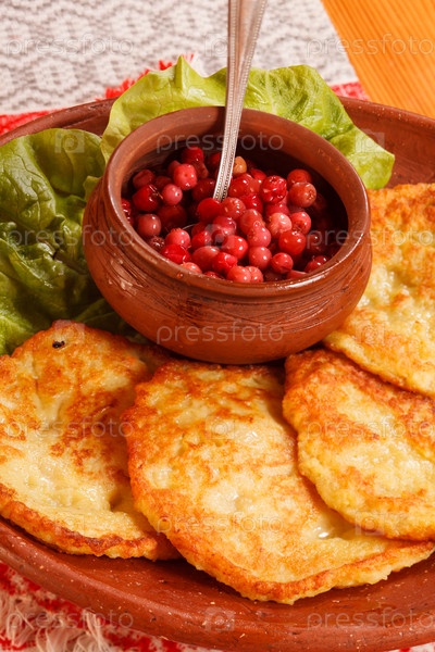 Картофельные оладьи с клюквенным соусом