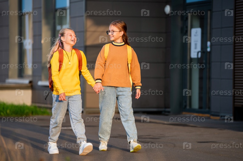 Двое счастливых детей идут в школу с рюкзаками по солнечной городской улице