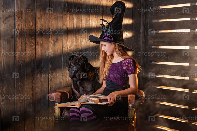 Девочка-подросток в костюме ведьмы и игривая черная собака породы шарпей сидят рядом с метлой и тыквами, а вокруг — дым и таинственная атмосфера Хэллоуина