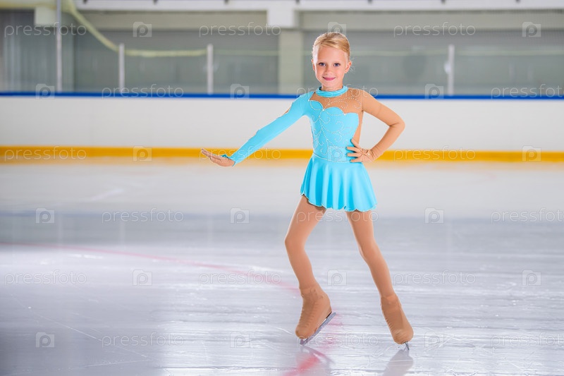 Портрет маленькой девочки в полный рост, занимающейся фигурным катанием на крытом катке во время выступления, место для копирования