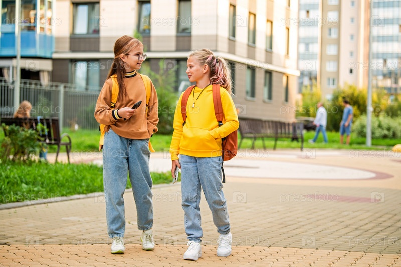 Двое счастливых детей идут в школу с рюкзаками по солнечной городской улице