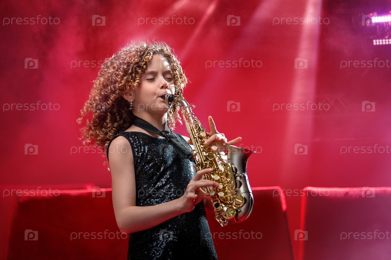 Молодая девушка-музыкант держит саксофон и улыбается. Она одета в черное платье и стоит на красном фоне в центре внимания