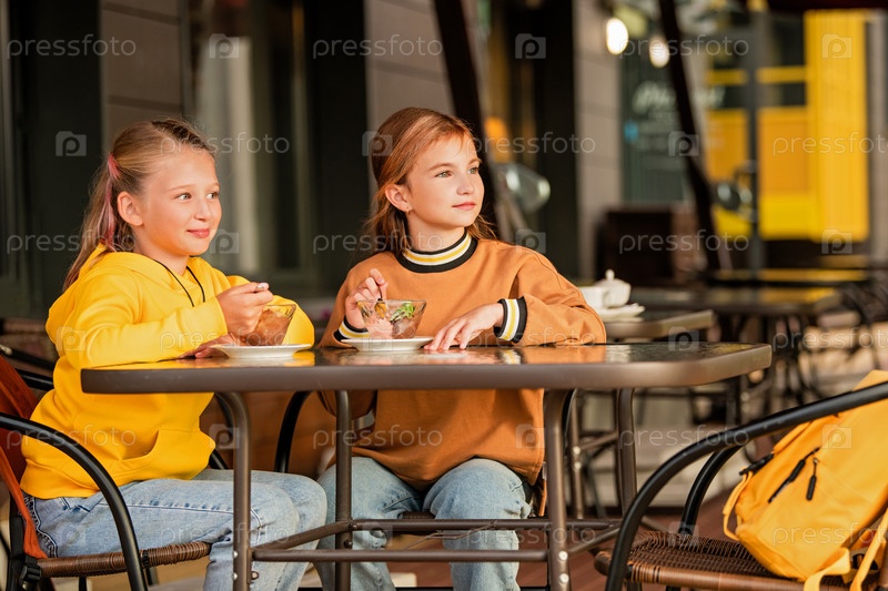 Две школьницы сидят за столиком в городском летнем кафе и пьют кофе и чай со сладостями