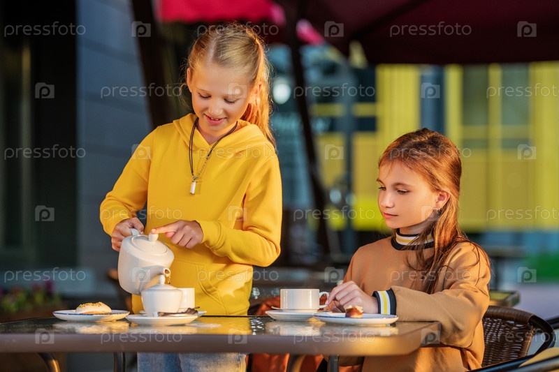 Две школьницы сидят за столиком в городском летнем кафе и пьют кофе и чай со сладостями