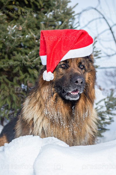 Очаровательная овчарка с радостным выражением мордочки, одетая в шапку Санты, наслаждается снежным зимним пейзажем под красивой елью во время рождественских праздников