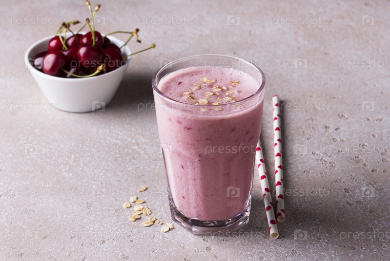 Молочный коктейль с вишней, йогуртом и овсянкой, соломинки для питья, миска со свежей вишней на бежевом фактурном фоне